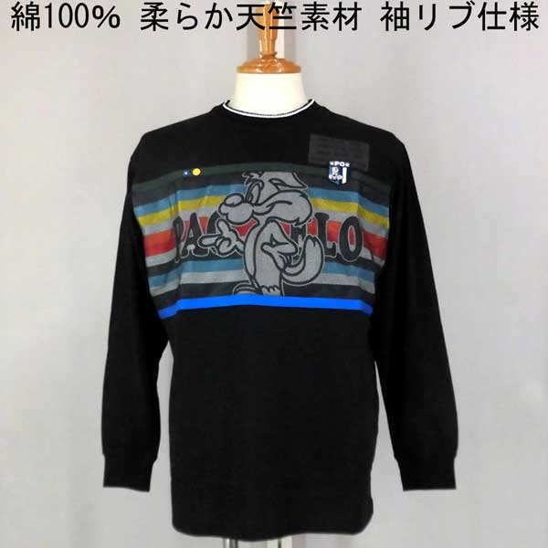 春 パジェロ 長袖Tシャツ/クルーネック カットソー 綿 キャラクタ—柄 黒 【L】【LL】